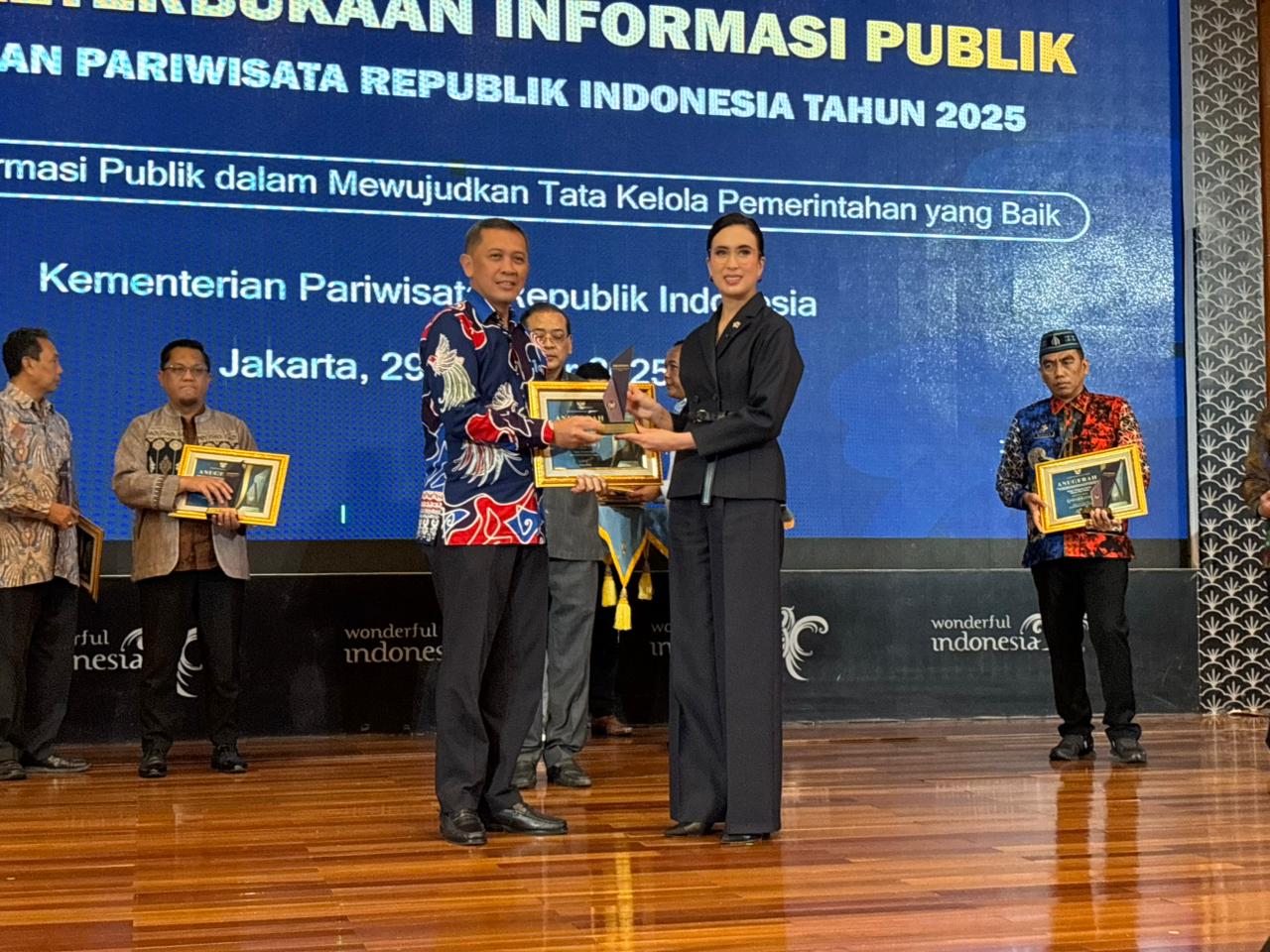 Penghargaan tersebut diserahkan langsung oleh Menteri Pariwisata, Widiyanti Putri Wardhana, bersama Ketua Komisi Informasi Publik (KIP), Donny Yoesgiantoro, dan diterima oleh Direktur Poltekpar Makassar, Dr. Herry Rachmat Widjaja, MM.Par., CHE., di Balairung Soesilo Soedarman, Gedung Sapta Pesona, Jakarta Pusat, pada Rabu (29/10/2025).