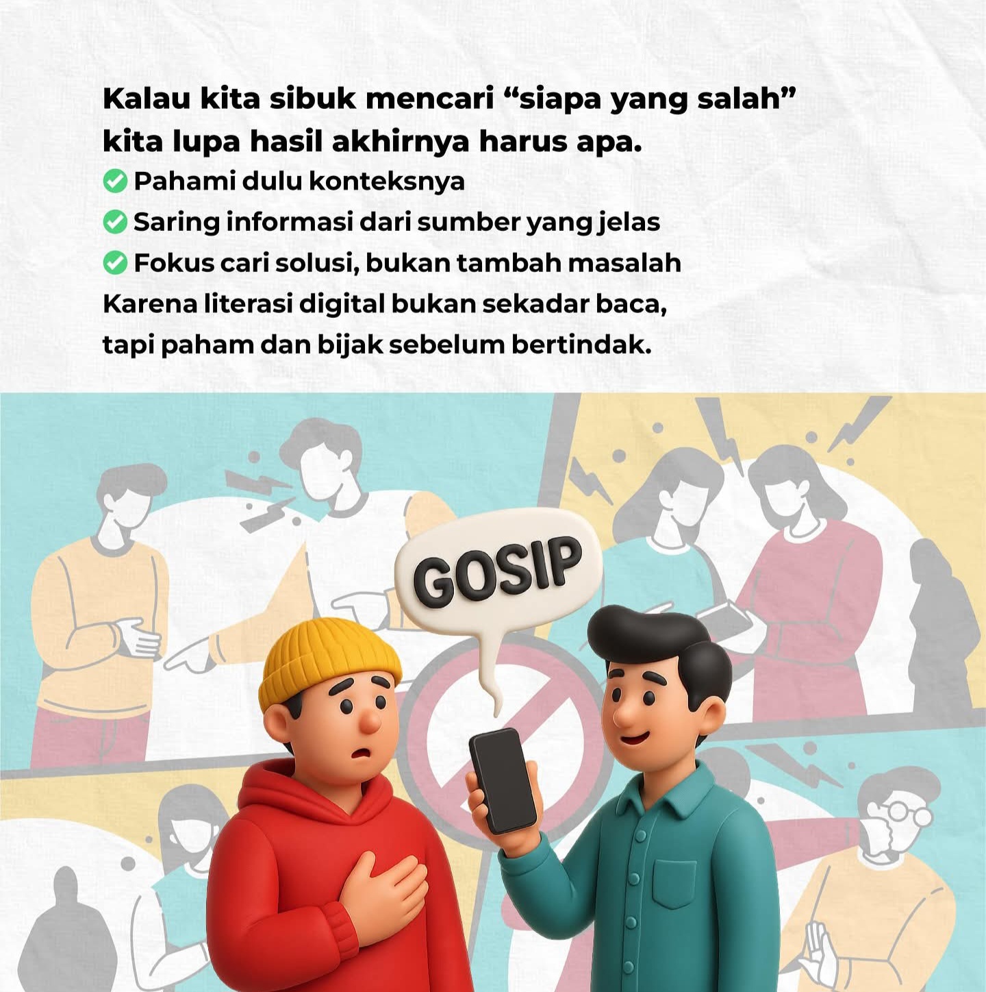 Pesan ini sejalan dengan prinsip Fokus verifikasi, bukan sensasi. Menurut Diskominfo, menjadi warga digital yang cerdas tidak hanya berarti memahami teknologi, tetapi juga membangun sikap dan tanggung jawab dalam bermedia.
