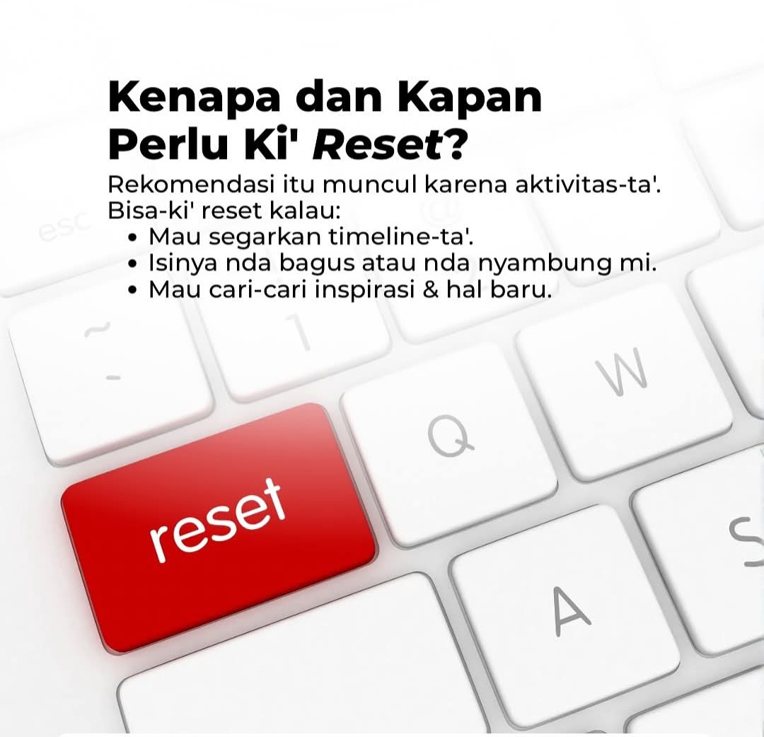 “Sobat Digital sudah tau? Ternyata kita’ bisa kendalikan sendiri rekomendasi konten yang muncul di timeline-ta’! Mari-ki’ pelajari cara reset dan atur preferensi konten di Instagram, TikTok, dan Facebook biar isi feed-ta’ lebih segar dan sesuai minat-ta’,” tulis Diskominfo Makassar dalam unggahan tersebut, Senin (31/10/2025).