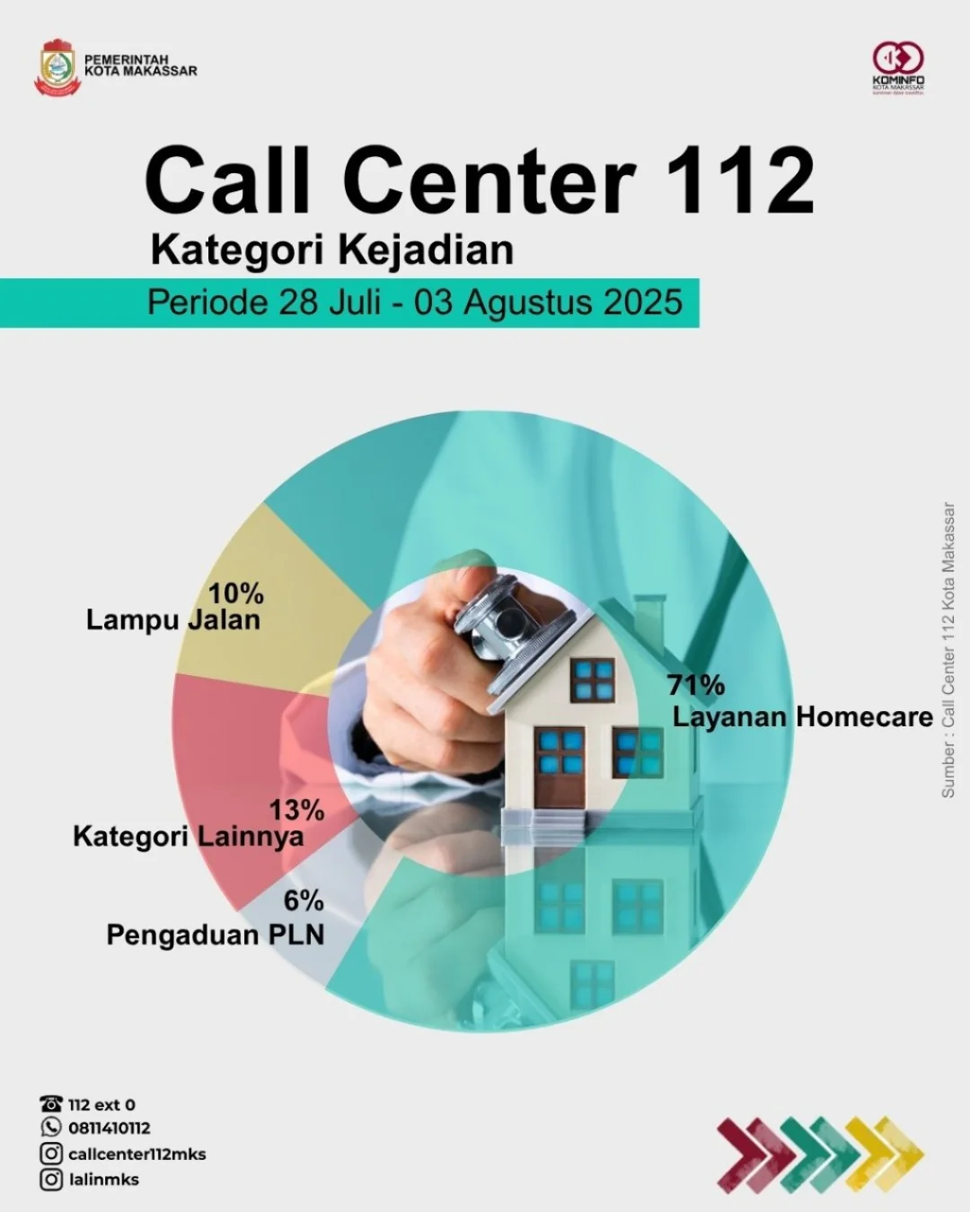 “Sementara itu, secara keseluruhan, kejadian yang paling sering diterima layanan Call Center 112 Kota Makassar periode 28 Juli – 3 Agustus 2025 adalah pelayanan kesehatan (Home Care), yaitu sebanyak 71 persen. Adapun pada periode ini terjadi sekitar 10 persen pengaduan terkait lampu jalan,” demikian laporan resmi di Instagram Diskominfo Makassar.