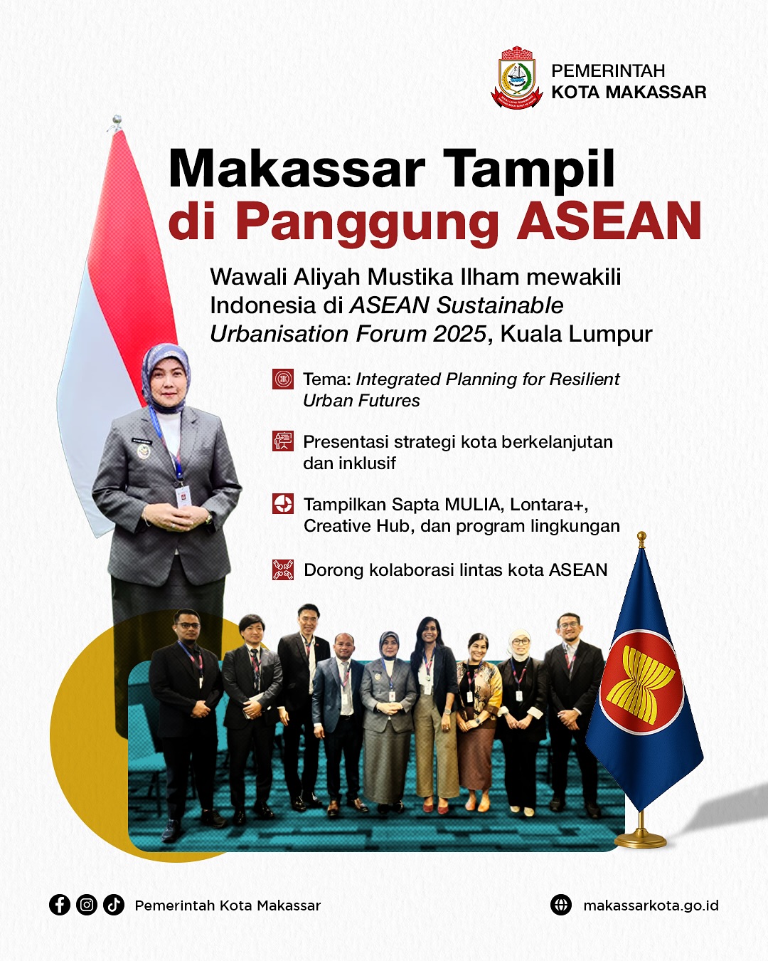 “Makassar kembali tampil di panggung internasional! Pada ASEAN Sustainable Urbanisation Forum 2025 di Kuala Lumpur, dengan tema ‘Integrated Planning for Resilient Urban Futures’—perencanaan kota terpadu untuk masa depan yang tangguh,” demikian penyampaian Diskominfo Makassar dalam unggahan instagram resminya.